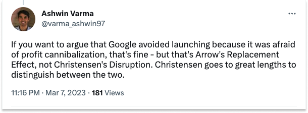 相應(yīng)地,阿羅替代效應(yīng)(Arrow’s Replacement Effect)在這里多少會(huì)發(fā)揮一點(diǎn)作用,正如 Ashwin Varma 在 Twitter 上指出的那樣: