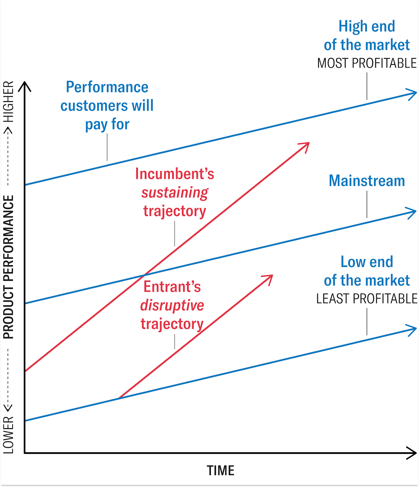 因此,既有企業(yè)會(huì)回避新技術(shù)(即便他們本身往往是新技術(shù)的開發(fā)者?。?,轉(zhuǎn)而專注于服務(wù)高端市場(chǎng),忽略低端市場(chǎng)(或目前不存在的潛在市場(chǎng)),從而給新進(jìn)入者留下了立足點(diǎn),讓后者用顛覆性技術(shù)來服務(wù)低端市場(chǎng)或新市場(chǎng),然后利用其不斷改進(jìn)的性能進(jìn)入主流。