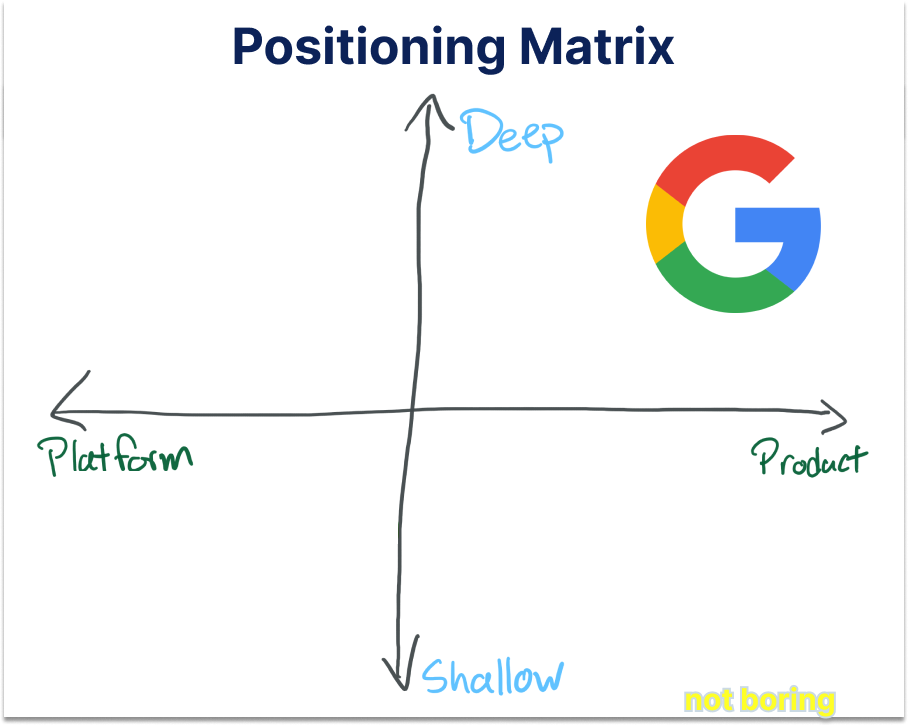 定位矩陣深度這個(gè)軸向很容易就能看明白。大體上,一家公司做一件事情的時(shí)間越長(zhǎng),做得越好,其定位就越深入。但另一個(gè)軸向,也就是產(chǎn)品/平臺(tái)軸向,對(duì)于了解公司在面對(duì)重大技術(shù)或商業(yè)模式轉(zhuǎn)變時(shí)將如何應(yīng)對(duì)也同樣重要。