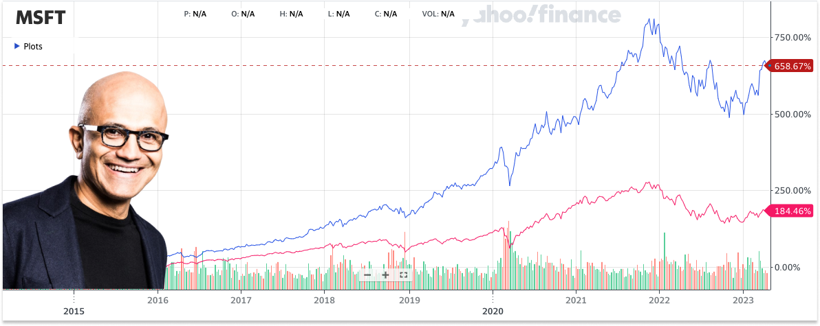 從這個(gè)定位來看,不管后面推出什么東西,只要有企業(yè)來買,微軟就能迅速適應(yīng),以任何形式向他們出售生產(chǎn)力。因此,自納德拉上任以來,微軟的股價(jià)上漲了 650% 以上,表現(xiàn)遠(yuǎn)遠(yuǎn)超過納斯達(dá)克指數(shù)。
