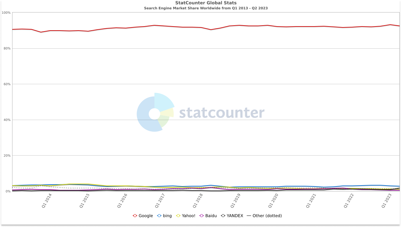 谷歌在全球搜索市場(chǎng)的份額幾乎無可撼動(dòng),過去十年,盡管人人都嚷嚷著說它要消亡,但這個(gè)份額一直保持在 90% 和 93% 之間,上個(gè)季度更是達(dá)到了 93.1% 的歷史新高。