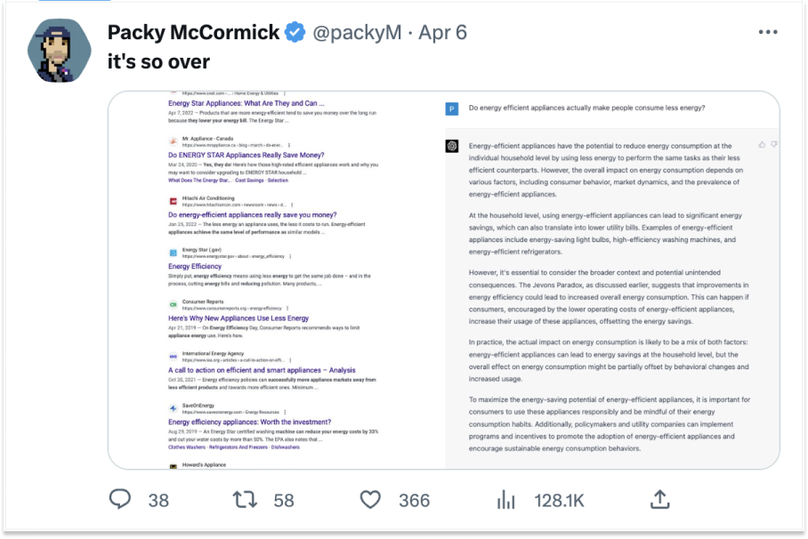 Google.com 是全世界訪問量最大的網(wǎng)站。當(dāng)注意力就是你的全部所需時(shí),這份資產(chǎn)的價(jià)值無可估量。雖然 ChatGPT 和 Bing 已經(jīng)斬獲了了早期的注意力,但如果谷歌動(dòng)作相對(duì)較快的話,大多數(shù)人與基于 LLM 的產(chǎn)品的第一次接觸將是在谷歌這里進(jìn)行的。