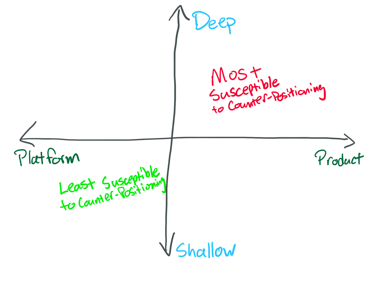 靠近產(chǎn)品側(cè)的公司比靠近平臺(tái)側(cè)的公司更容易受到反定位的影響,因?yàn)槠脚_(tái)開發(fā)出來的功能比開發(fā)任何單一產(chǎn)品的都要多。當(dāng)一種新技術(shù)以及一種新的商業(yè)模式出現(xiàn)時(shí),相對(duì)于產(chǎn)品公司,平臺(tái)公司將其融入到自身的能力當(dāng)中這件事,會(huì)容易一些。